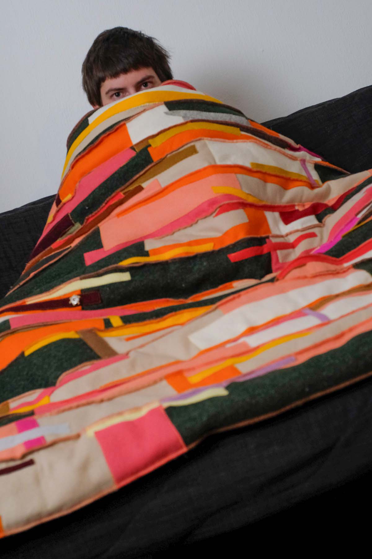The couch cow is a wearable that offers containment in moments of overwhelmedness and sensory overload. The felt scrap patchwork creates a steady structure with weight. The inside is softly padded and lined with a high quality cotton fabric. Five press studs make the couch cow highly flexible. By closing the buttons on the top a wide hood is created. When seeking containment two additional buttons can be closed and opened easily. Without closing the buttons, the couch cow can lay completely flat, resembling a cow hide.